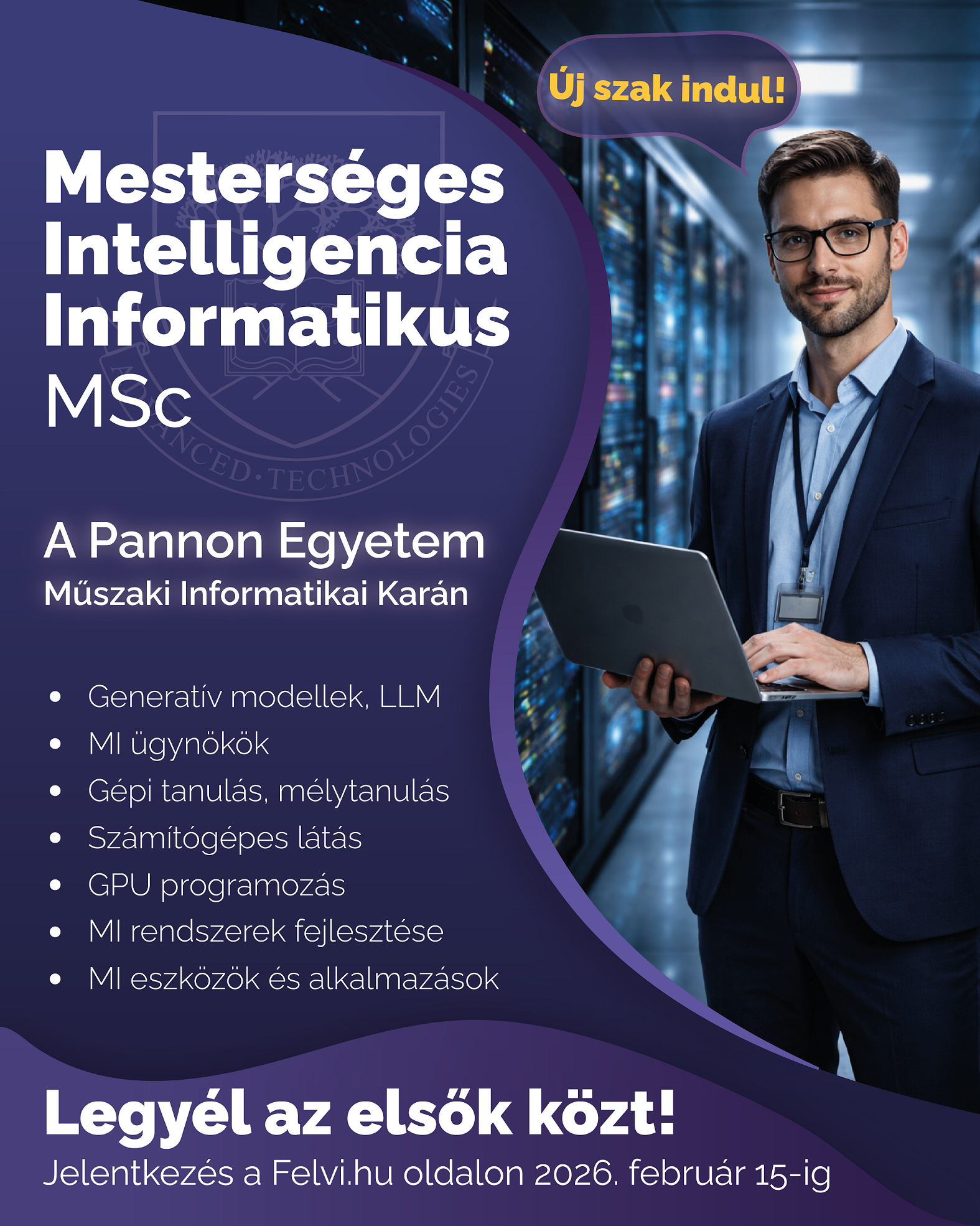 E robbanásszerű fejlődésből adódóan minden eddiginél nagyobb szükség van olyan szakemberekre, akik nemcsak értik az MI működésének alapelveit, hanem képesek MI-alapú rendszerek tervezésére, fejlesztésére és felelős alkalmazására. Eme piaci igényekre reagálva a Pannon Egyetem Műszaki Informatikai Kara (PE-MIK) 2026 szeptemberében új, Mesterségesintelligencia-informatikus MSc képzést indít nappali és levelező tagozaton!